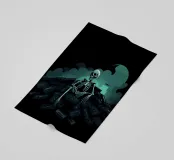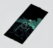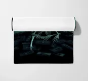 Uno scheletro reclinato in mezzo a una pila di cassette vintage, circondato da una nebbia spettrale e da sagome inquietanti, che evocano un'atmosfera nostalgica e agghiacciante, perfetta per Halloween.