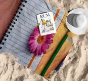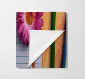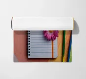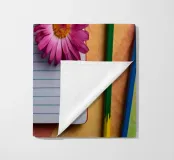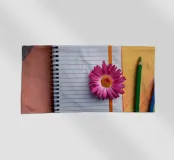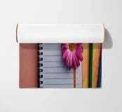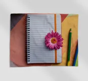 Un vivace spazio di lavoro mostra un quaderno a righe ornato da un fiore rosa, circondato da carte colorate e materiale artistico, che invita alla creatività e all'ispirazione.
