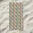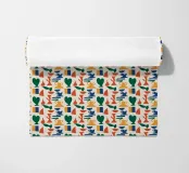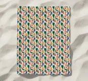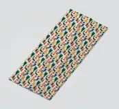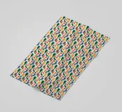 Un motivo colorato e ripetuto è composto da forme astratte nelle tonalità del verde, del giallo, del blu e del rosso. Ogni elemento forma una disposizione geometrica che crea un effetto visivo vibrante e ritmico.