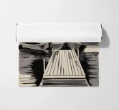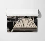 Barche a vela a strisce attraccate a un molo in bianco e nero ad alto contrasto, che evocano un'audace forza grafica.