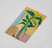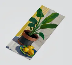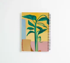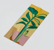Una natura morta semplice ed elegante, incentrata su una rigogliosa pianta verde in un vaso beige, sullo sfondo di un solido giallo brillante per un audace tocco di colore.