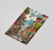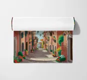 Una veduta prospettica di una strada europea stretta e tortuosa, fiancheggiata da edifici colorati, piante in vaso e diretta verso un cielo luminoso e nuvoloso.