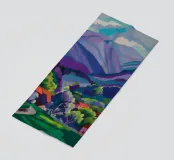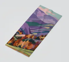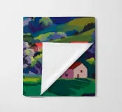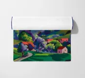 Un colorato dipinto paesaggistico raffigura un villaggio adagiato sul fianco di una collina con campi vibranti, simili a macchie, nei toni del verde, del blu e del viola, con case dai tetti rossi sotto un cielo limpido.