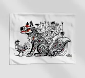 Volpe VR e la sua gallina, stile graffiti, stile urbano, arte da parete, natura, organico ed elettronico/meccanico. Da un disegno unico originale dipinto a mano dall'artista francese Shag con sede ad Annecy, Francia. Originariamente dipinto con acrilico su tavola di legno.