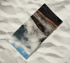 Un vulcano torreggiante si staglia contro il cielo, con le sue pendici scure striate da vecchie colate di lava. Densi pennacchi di fumo salgono dal cratere, si disperdono nell'aria e dipingono l'orizzonte con sfumature di grigio. L'atmosfera è tesa e viva, come se la terra stessa respirasse.