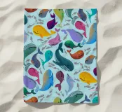 Tante balene colorate disegnate a mano e immerse nell'acqua con pesciolini e bolle.