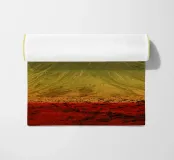 Un paesaggio desertico astratto con sabbia in primo piano e montagne rosse e gialle sullo sfondo. Sensazione di Giappone minimalista