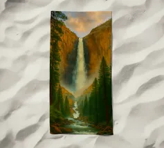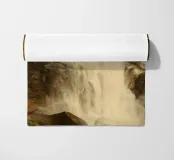 La nebbia sale alla sua base, riempiendo l'aria di freschezza, mentre il potente scroscio si fonde con i dolci suoni della natura, creando una scena maestosa e serena.