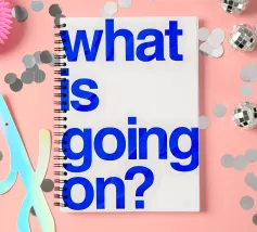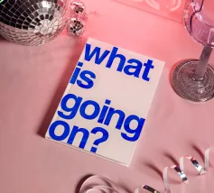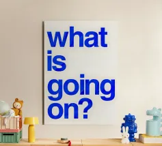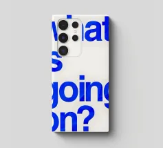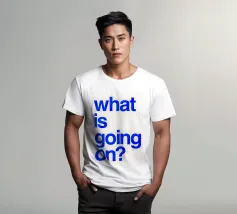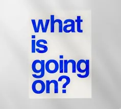 Un design minimalista con un testo blu grande e deciso su uno sfondo bianco. Si legge: "cosa sta succedendo?". La frase e lo stile suggeriscono confusione, sorpresa o domanda esistenziale in modo drammatico ma semplice.