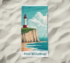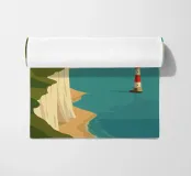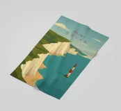 Design di viaggio minimalista dell'Inghilterra meridionale con le famose scogliere bianche (chalk cliffs) e il faro sulla costa inglese vicino a Dover. Tipico paesaggio di scogliere chiare.