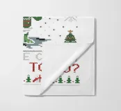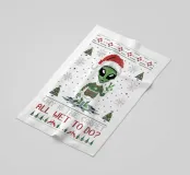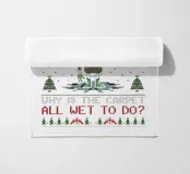 Un alieno con cappello da Babbo Natale e maglione natalizio è circondato da fiocchi di neve e alberi di Natale. Il disegno chiede ironicamente: "Perché il tappeto è tutto bagnato?" con colori festosi.