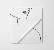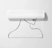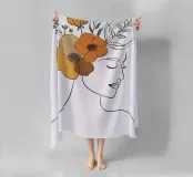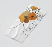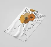 Un disegno al tratto minimalista raffigura il profilo di una donna dall'espressione serena. I suoi capelli sono ornati da grandi fiori stilizzati di colore arancione e giallo e da foglie delicate.