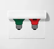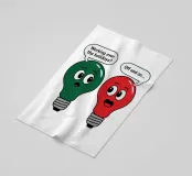 Due lampadine dei cartoni animati, una verde e una rossa, si confrontano in una conversazione scherzosa sul lavoro durante le vacanze. La lampadina verde pone la domanda, mentre la lampadina rossa risponde con umorismo.