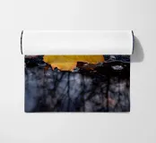 Una foglia d'acero gialla giace accanto a una pozzanghera in cui si specchiano gli alberi