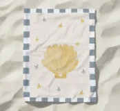 Una graziosa conchiglia gialla dipinta ad acquerello circondata da stelle gialle e blu, con una cornice bianca e blu di tendenza.