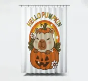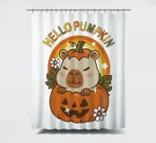 Animale capibara super carino seduto nella zucca intagliata di Halloween con un arcobaleno arancione, fiori, testo in stile autunnale citazione Ciao Zucca