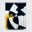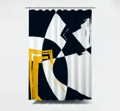Forme astratte in nero, bianco e oro creano una composizione dinamica con curve fluide e angoli acuti. Il gioco di colori aggiunge profondità e movimento, suggerendo un senso di energia e contrasto.