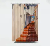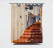 Uno stretto passaggio illuminato dal sole tra edifici bianchi è caratterizzato da una serie di scale rosso cremisi che creano una composizione audace, grafica e architettonicamente interessante, ricca di fascino mediterraneo.