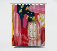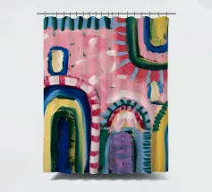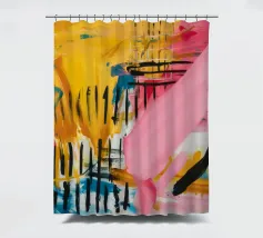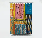 Un patchwork di motivi diversi, tra cui linee e forme a U, nei vivaci colori giallo, blu, rosa e rosso, crea un colorato effetto mosaico in questo pezzo astratto.