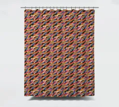 Un motivo ripetuto di linee diagonali e forme geometriche in vari colori. Il disegno utilizza tonalità audaci e contrastanti per creare un effetto visivo vibrante.