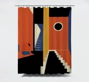 Primo piano astratto e minimalista di una forma architettonica, con una scala bianca e spoglia su una parete arancione con una finestra circolare nera e ombre profonde.
