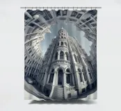 Un'accattivante vista con lente fisheye di un edificio in stile neoclassico circondato da strutture ornamentali in un cortile urbano. La prospettiva distorta enfatizza i dettagli intricati, la simmetria e la grandezza architettonica della scena.