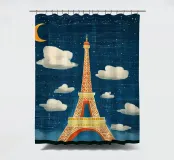 L'immagine mostra la Torre Eiffel in un cielo notturno di un blu intenso, con nuvole bianche, stelle scintillanti e una mezzaluna arancione. La torre stessa risplende nei toni caldi del giallo e dell'arancione e si staglia radiosa sullo sfondo scuro. Lo stile è chiaramente illustrativo e artistico, un misto di romanticismo sognante e colorazione espressiva. Ricorda un dipinto o un poster digitale che enfatizza l'atmosfera e lo stato d'animo piuttosto che la precisione realistica. Un gioco visivamente affascinante tra fantasia e punto di riferimento.