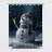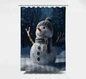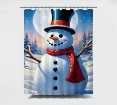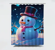 Un pupazzo di neve adornato con un cappello e una sciarpa si gode la serena bellezza di una foresta innevata al chiaro di luna, circondato da fiocchi di neve che cadono.