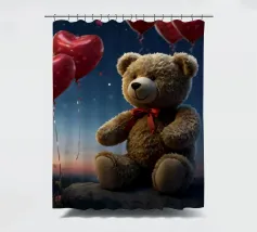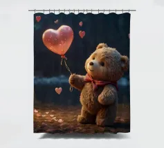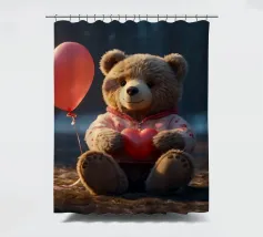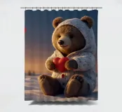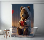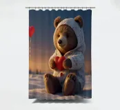 Un simpatico orsacchiotto vestito con un'accogliente felpa con cappuccio siede nella neve, tenendo gioiosamente un cuore rosso mentre un palloncino si muove nell'aria fresca della sera sotto un tramonto colorato.