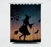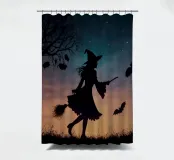 Al calare del crepuscolo, una strega in silhouette vola a cavallo della sua scopa tra i pipistrelli, con una zucca incandescente in primo piano, creando un'atmosfera incantevole.