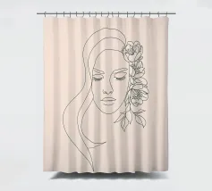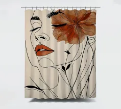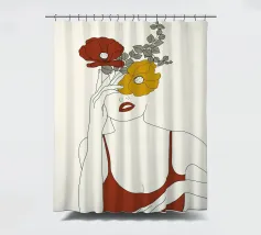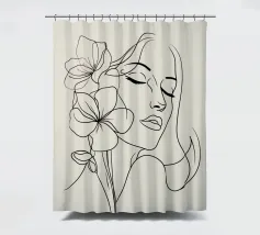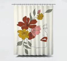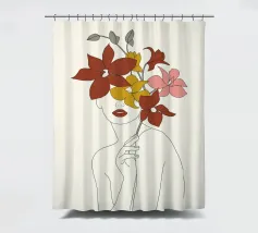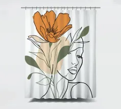 Un disegno al tratto minimalista raffigura il profilo di una donna dall'espressione serena. I suoi capelli sono ornati da grandi fiori stilizzati di colore arancione e giallo e da foglie delicate.