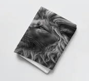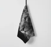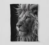 Questo impressionante ritratto in bianco e nero di un maestoso leone mostra l'imponente criniera e il potente muso in un dettagliato primo piano. La composizione minimalista e la fine trama della pelliccia sottolineano la bellezza naturale e la forza di questo animale selvaggio.