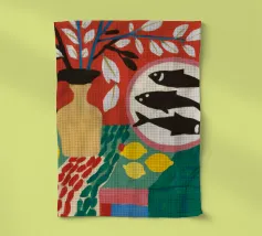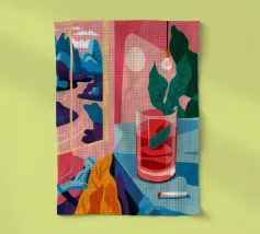 Una natura morta astratta e altamente stilizzata che presenta una bevanda in un bicchiere di vimini con una cannuccia blu. La scena è ambientata su una superficie con audaci motivi rossi e gialli, su uno sfondo verde strutturato.