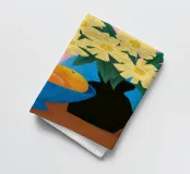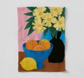 Un'elegante e semplice natura morta con un bouquet di fiori gialli in un vaso scuro accanto a una ciotola blu profondo piena di arance fresche. La composizione è serena e senza tempo, con un bel contrasto di colori.