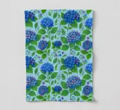Grazioso motivo floreale con fiori di ortensia blu, rigogliosi e vivaci, con foglie verdi, su uno sfondo azzurro.