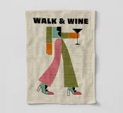 Il motivo "Walk & Wine" mostra una figura geometrica stilizzata che cammina con un bicchiere di vino in mano. Disegnata con colori vivaci come il verde oliva, il rosa e il turchese, l'immagine combina moda, movimento e piacere del vino in modo umoristico. Il design minimalista, con forme chiare e fascino retrò, lo rende una dichiarazione moderna per gli amanti del vino e del design.