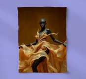 Modella di moda surreale con un abito vorticoso al latte Questa immagine mostra una modella che indossa un abito fluido e liquido in un ambiente caldo e dorato, con colori vibranti e dettagli intricati, che fonde l'alta moda con elementi surreali.