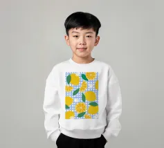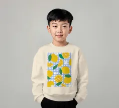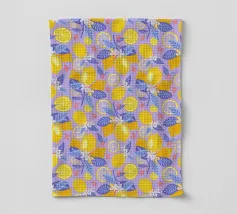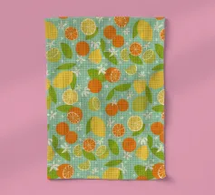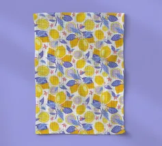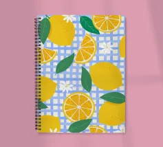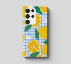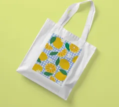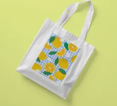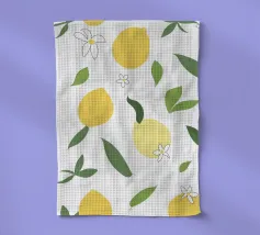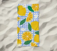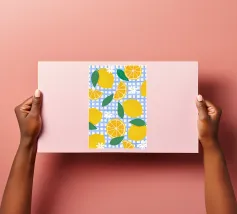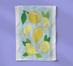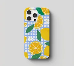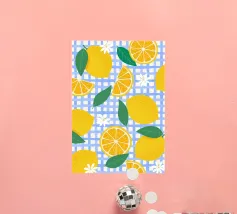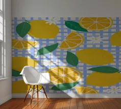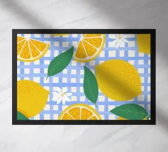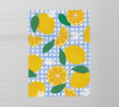 design di limoni, motivo di agrumi, decorazioni per la cucina estiva, illustrazione di frutta, arte a scacchi blu, stampa fresca e vibrante