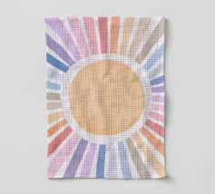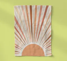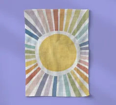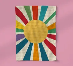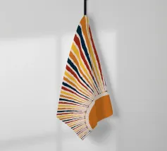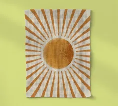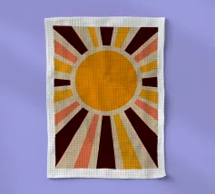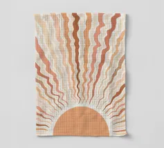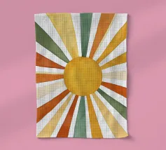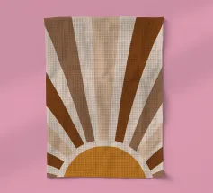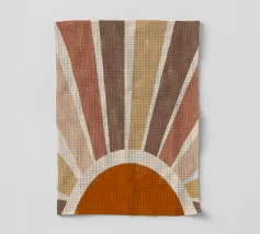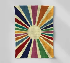 Linee radianti in tonalità terrose come il verde, il marrone e l'arancione si estendono da un cerchio centrale, creando un effetto a raggiera. Il design è caratterizzato da un'estetica retrò con motivi simmetrici e una tavolozza di colori rilassanti.