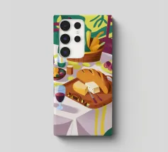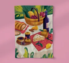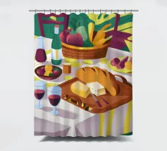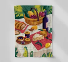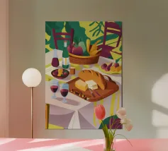 Un incontro rustico all'aperto con vino, pane e formaggio, che evoca un senso di unione e indulgenza.