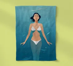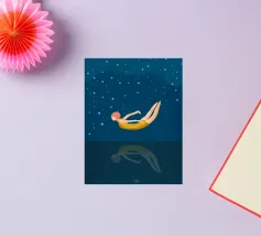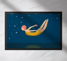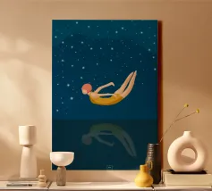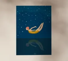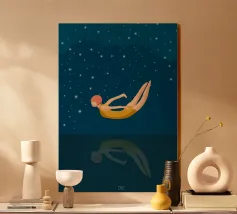 Un momento di quiete tra sogno e realtà: una donna in costume da bagno giallo galleggia senza peso sull'acqua, il suo riflesso si confonde nelle profondità notturne. Le stelle scintillano sopra di lei, il silenzio si trova sotto: un simbolo di coraggio, di lasciarsi andare e di tuffarsi nell'ignoto. Il poster combina un design minimalista con un fascino retrò e un tocco di malinconia. Perfetto per chi cerca calma, eleganza e profondità emotiva nella propria arte da parete. Ideale per camere da letto, soggiorni o spazi creativi che amano l'arte moderna e senza tempo.