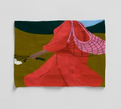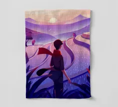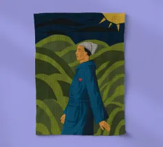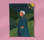 Il ritratto di una donna con un foulard bianco, che indossa un cappotto verde, si trova pacificamente in un campo verde ondulato sotto un cielo notturno stellato, trasmettendo un profondo senso di serenità e di connessione con la natura.