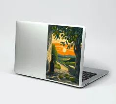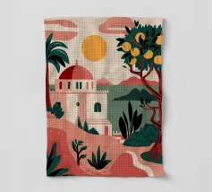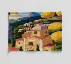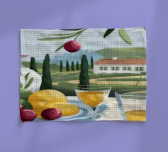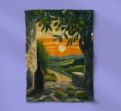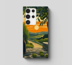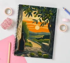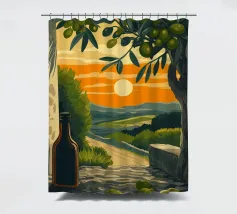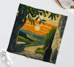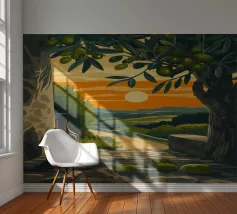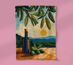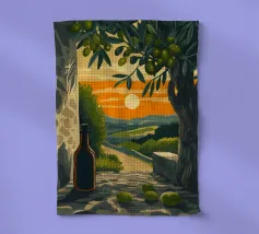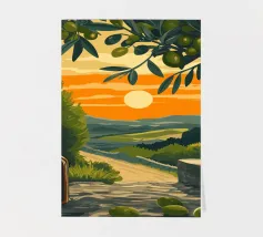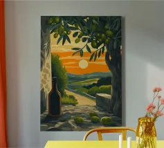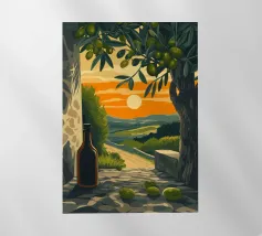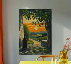 Questa immagine vi trasporta in un caldo paesaggio estivo al tramonto. Olive verdi e mature pendono pesantemente dai rami, una bottiglia di olio d'oliva si trova accanto al sentiero che conduce alle colline. I toni di colore dell'arancio e del verde si fondono in una scena armoniosa. Ideale per cucine di ispirazione mediterranea, ristoranti o per chiunque abbia voglia di sud.