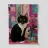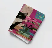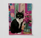 Un'affascinante illustrazione di un gatto smoking bianco e nero seduto con orgoglio davanti a un vaso di peonie rosa, su uno sfondo a fantasia. L'opera d'arte è un'ode dolce ed elegante ai gatti e ai fiori.