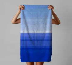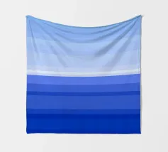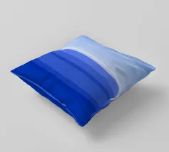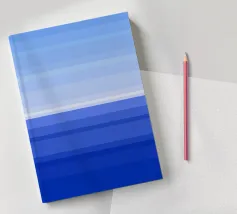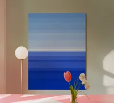 Il mare calmo, che si fonde senza soluzione di continuità con il cielo oltre l'orizzonte. Forme geometriche, minimaliste, astratte nei toni del blu. Vista sul mare. Pace, libertà, chiarezza.