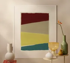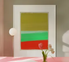 Un design minimalista caratterizzato da bande orizzontali di colori diversi. La composizione comprende tonalità di verde acqua, beige, marrone e nero.