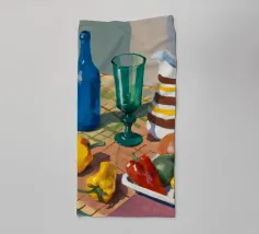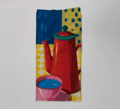 Una natura morta astratta e altamente stilizzata che presenta una bevanda in un bicchiere di vimini con una cannuccia blu. La scena è ambientata su una superficie con audaci motivi rossi e gialli, su uno sfondo verde strutturato.