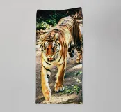 La maestosa tigre cammina lentamente verso la telecamera. Il suo corpo muscoloso con muscoli tesi si estendeva sotto la sua pelliccia dorata con evidenti strisce nere. I suoi occhi brillanti e acuti sembravano esaminarla e, insieme alla sua andatura aggraziata ma potente, la rendevano allo stesso tempo bella e terrificante. Ogni passo pesante ma deciso lasciava un segno sul terreno, mentre la lunga coda ondeggiava dolcemente per mantenere l'equilibrio. Il respiro profondo e lo sguardo fiero accentuavano ulteriormente la sua aura di re della giungla mentre si avvicinava.
