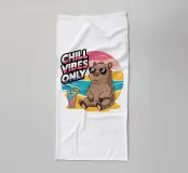 Un capibara rilassato con gli occhiali da sole si sdraia su una spiaggia con un drink tropicale e un vibrante tramonto sullo sfondo. La frase "Chill Vibes Only" è ben visibile accanto al capibara.