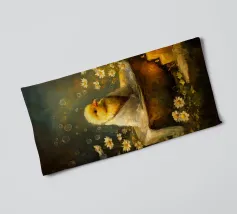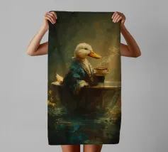 Un simpatico anatroccolo fa capolino da sotto un morbido asciugamano bianco. Le sue soffici piume gialle e i suoi occhi curiosi creano una scena adorabile e affascinante.